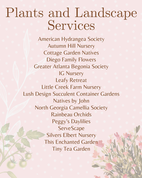 - Plants, plants and more plants–living finds for your gardens from cottage-style to zen and from groundcovers to understory shrubs/trees. Come and check out the Master Gardener donated pass-along plants, the annuals and perennials propagated in our greenhouse, our pollinator/native plant experience table, the sales by our partners–Georgia Native Plant Society (native plants) and Alpharetta Community Agriculture Program (edible garden plants), and our many different marketplace vendors