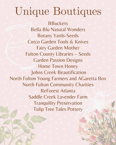 - Fleatique – a whimsy-filled shoppe full of donated and gently-loved gardening books, tableware, plant containers, yard “art”, furniture and more